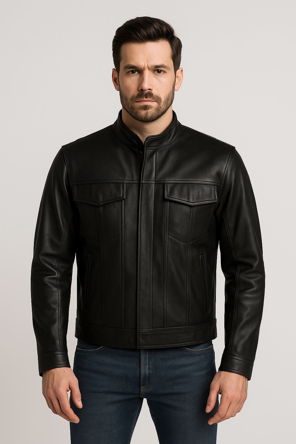 Step into timeless style with this black leather biker jacket featuring a structured fit, sharp shoulder lines, and military-inspired front flap pockets. Designed for both comfort and rugged appeal, the premium leather ensures durability while delivering a sleek, modern silhouette. Ideal for both casual and semi-formal wear, this jacket pairs effortlessly with jeans or chinos for an edgy yet refined look.