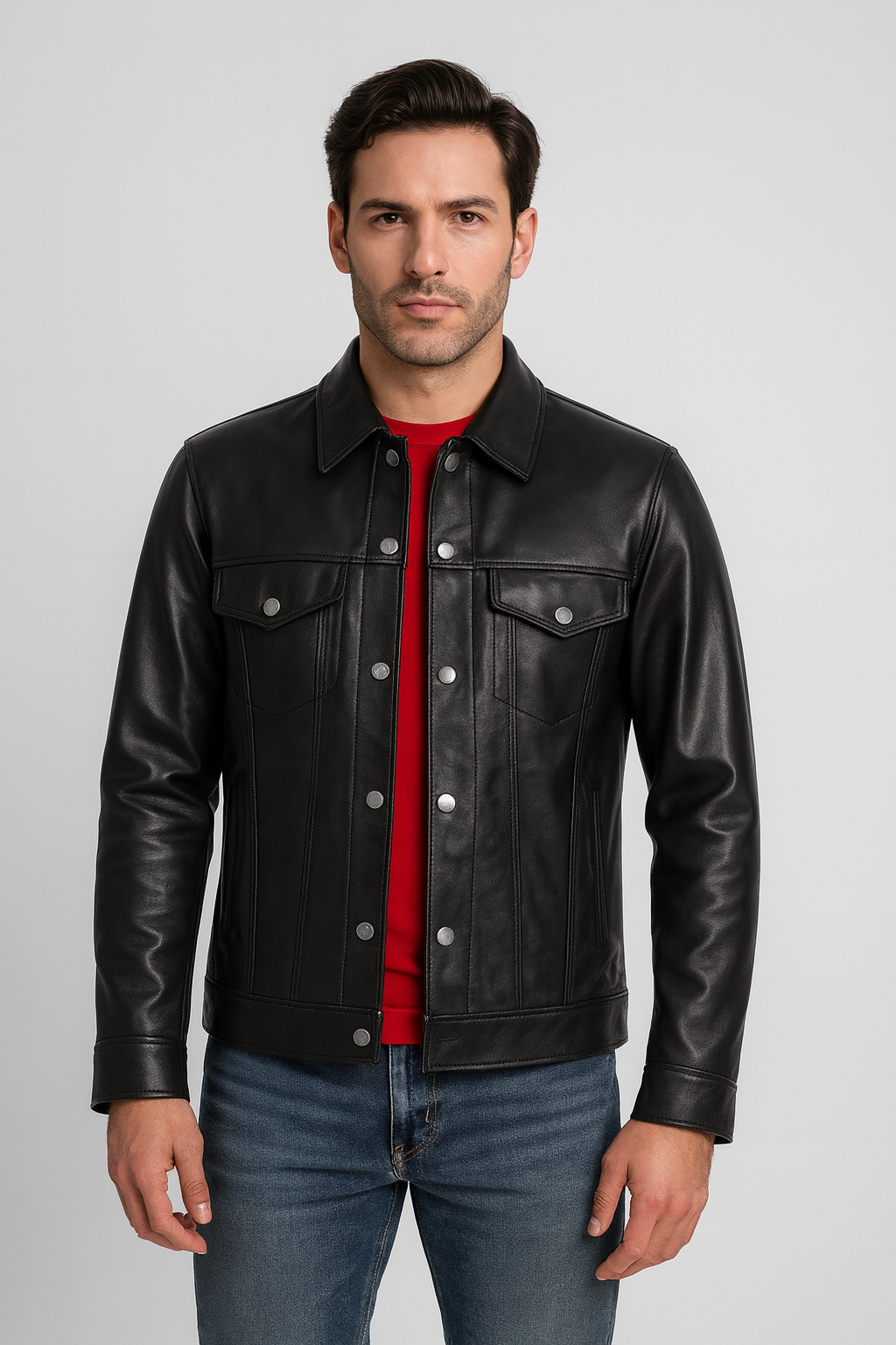 Elevate your wardrobe with this timeless black leather button-up jacket for men, crafted for a sharp and rugged appearance. Featuring a front button closure, dual chest flap pockets with silver buttons, and a tailored fit, this jacket combines classic styling with modern edge. The smooth leather finish and structured collar offer a bold look perfect for casual or semi-formal wear. Durable, comfortable, and stylish—this is a must-have piece for every fashion-forward man.