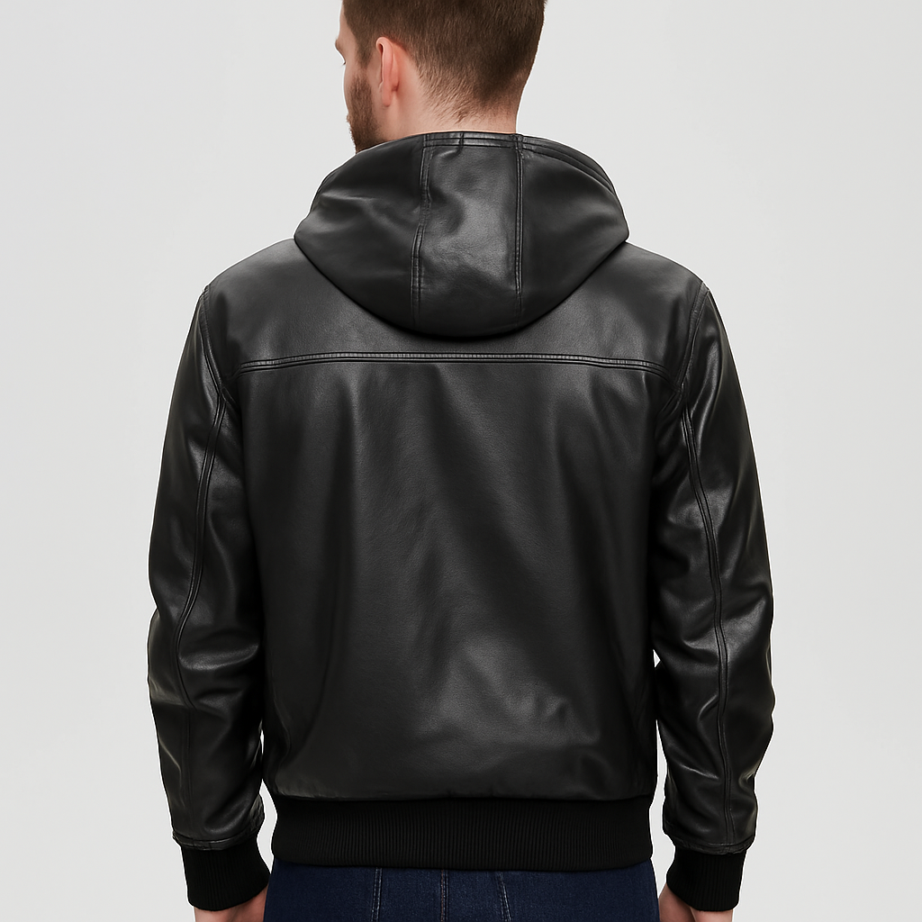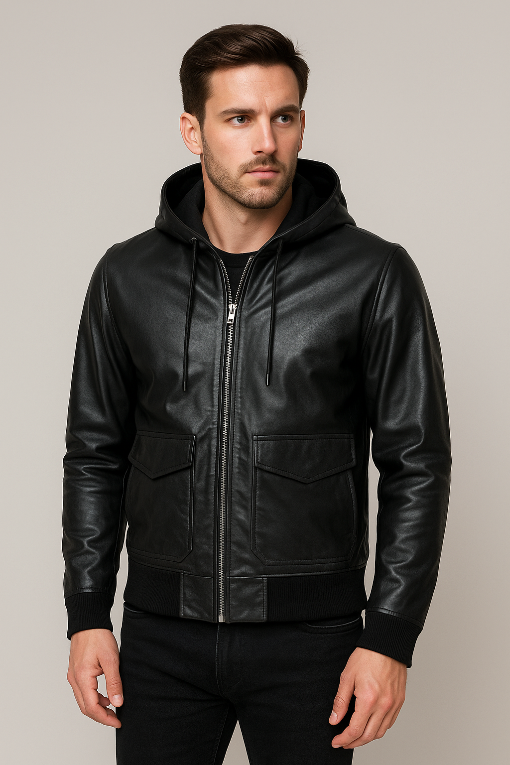 Make a bold statement with this sleek black leather hoodie jacket, designed for modern men who value both style and function. Crafted from high-quality leather, it features a zip-up front, soft inner lining, ribbed cuffs and hem, and an attached hood with drawstrings. Perfect for casual outings, bike rides, or everyday wear, this jacket blends comfort with a sharp urban edge. Ideal for layering in cooler seasons while keeping you effortlessly stylish.