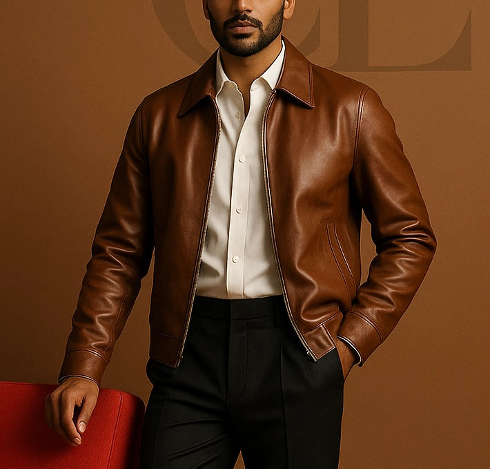 A sleek and sophisticated brown leather jacket designed for a refined look. Featuring a smooth finish, minimal stitching, and a clean zip-front closure, it pairs effortlessly with both formal and casual outfits, adding timeless elegance to any wardrobe.
