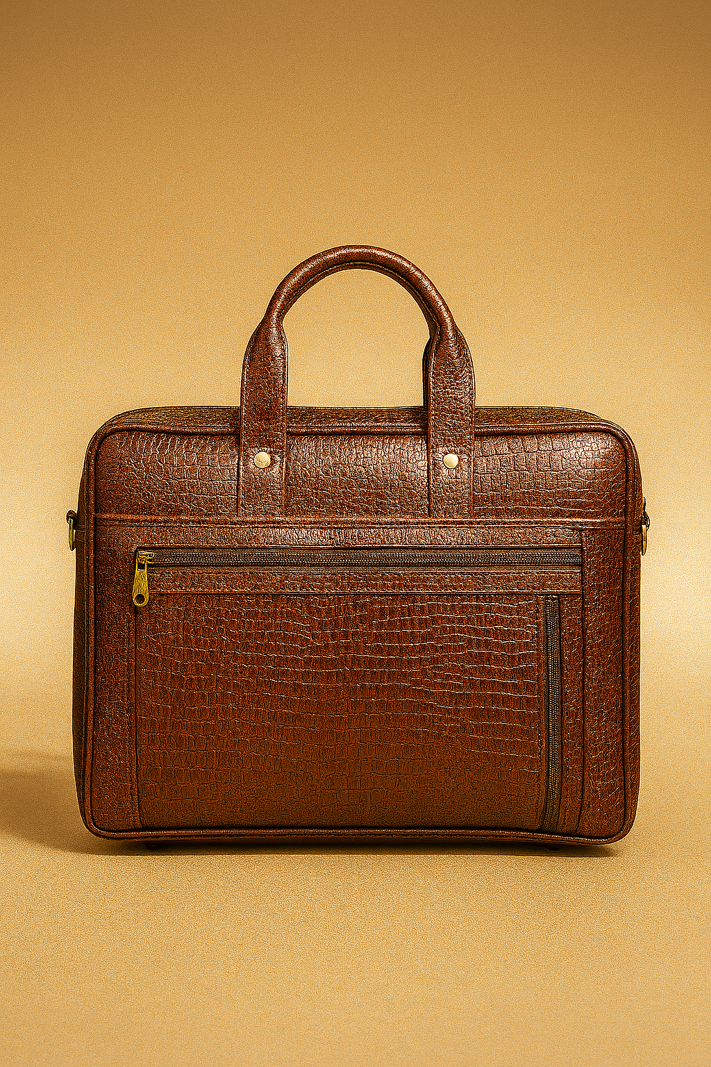 Combine practicality with timeless style in this classic textured brown leather laptop bag. Crafted from premium leather with a rich grain finish, it offers a spacious main compartment, a secure double-zippered front pocket, and sturdy top handles for easy carrying. The gold-tone hardware and refined stitching add a professional touch, making it ideal for business meetings, office commutes, or travel.