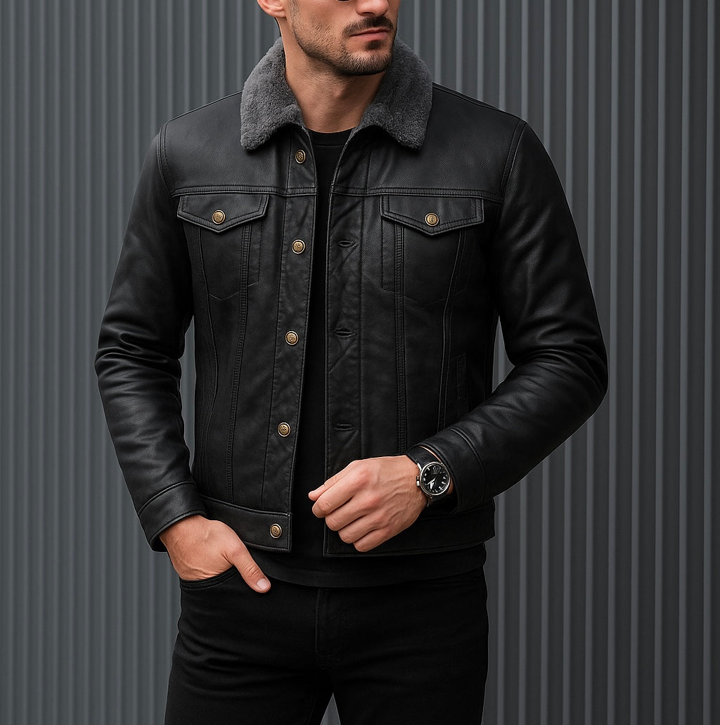 Upgrade your winter wardrobe with this black shearling collar leather jacket, crafted for style and warmth. Made from premium quality genuine leather, it features a soft grey shearling collar, button-front closure, and tailored stitching for a sleek silhouette. Perfect for layering over casual or smart outfits, this jacket delivers both durability and sophistication.