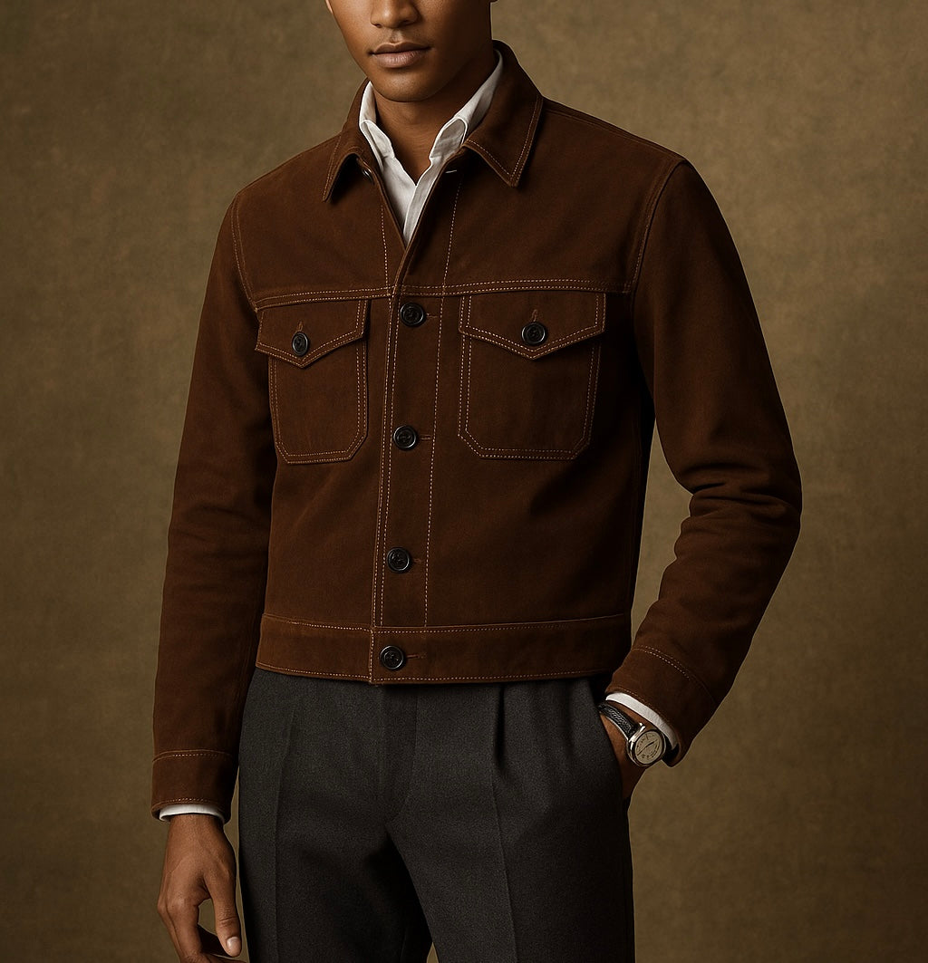 Step up your wardrobe with this dark brown suede button-up jacket, blending timeless design with modern elegance. Featuring a shirt-style collar, flap chest pockets, and contrast stitching, this jacket is the perfect balance of smart and casual.