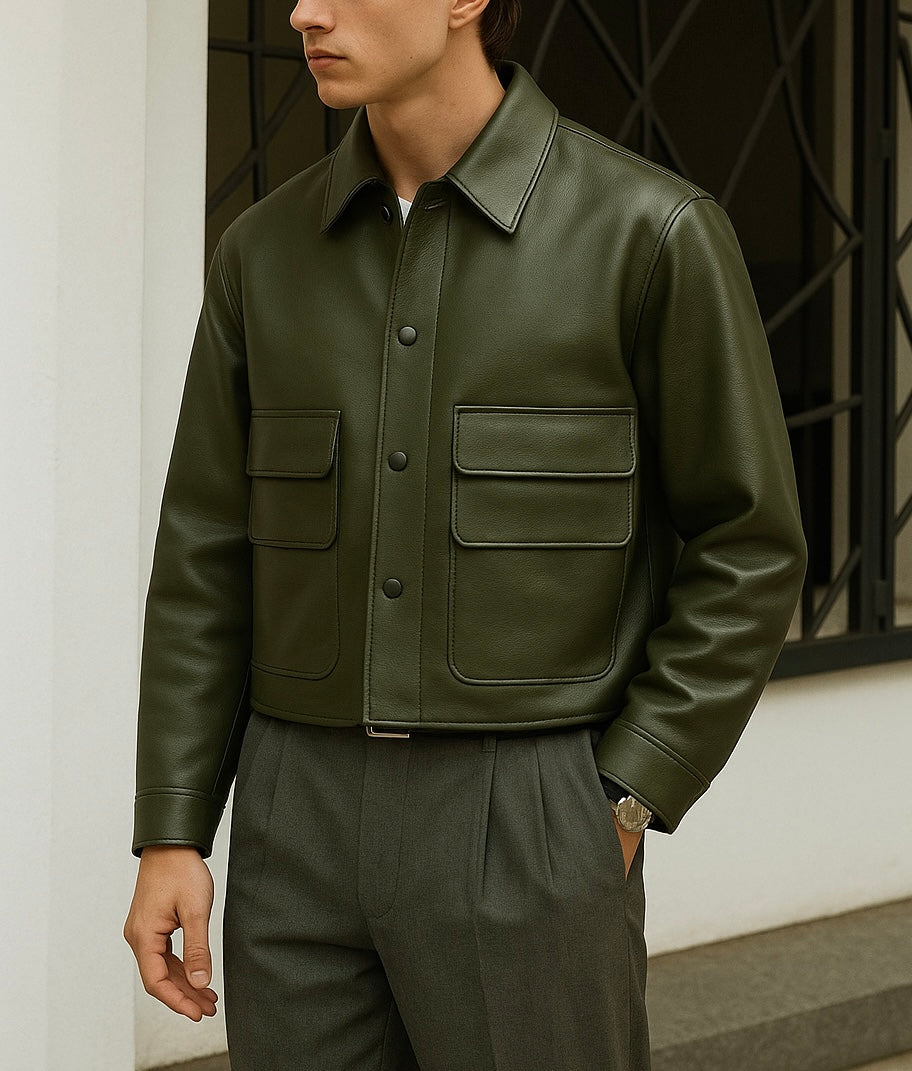 Redefine modern elegance with this men's olive green leather jacket, crafted from premium genuine leather for a sleek, structured silhouette. Designed with a button-up front, pointed collar, and oversized dual flap pockets, it delivers both practicality and style. The cropped fit and minimalist design make it perfect for pairing with trousers or denim, offering a contemporary twist on classic outerwear.