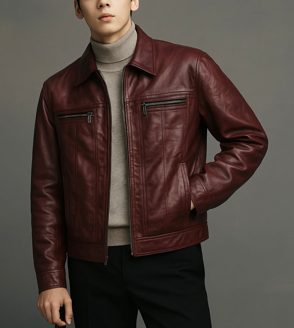 Add refined sophistication to your wardrobe with this men's burgundy leather jacket, crafted from premium genuine leather for durability and timeless appeal. Featuring a zip-up front, pointed collar, dual zippered chest pockets, and side pockets, it offers both style and practicality. Perfect for casual outings, evening wear, or smart-casual layering, this jacket is a versatile must-have for modern men.