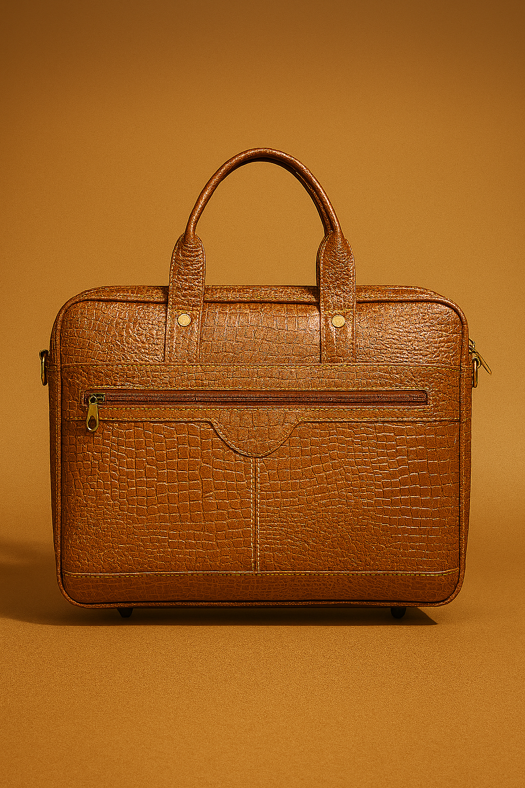 Elevate your work style with this premium croc-textured leather laptop bag, designed for professionals who value both elegance and functionality. Crafted from high-quality leather with a rich tan finish, it features a spacious main compartment for your laptop, secure zippered closures, and a front pocket for quick-access essentials. Sturdy handles, gold-tone hardware, and fine stitching add a touch of sophistication, making it perfect for business meetings, travel, or daily office use.