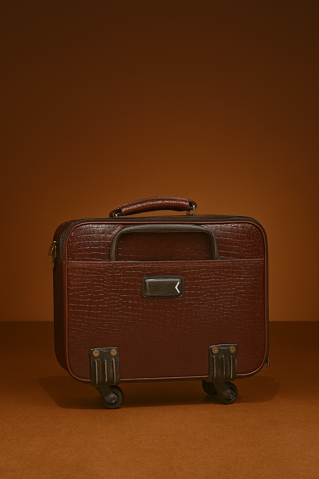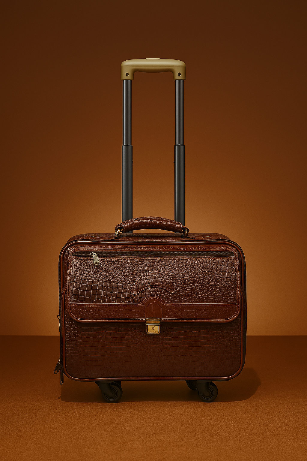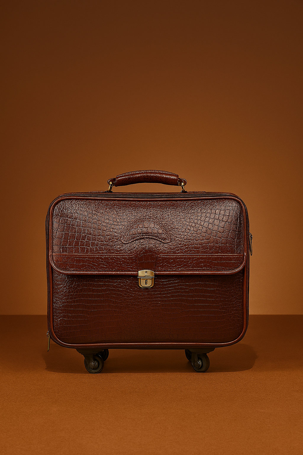 Refined and reliable, this vintage brown leather trolley briefcase is the perfect partner for professionals on the go. Featuring a crocodile-embossed finish, classic top handle, and a secure front clasp lock, this compact bag combines elegance with practical mobility. With smooth-rolling wheels and brass hardware accents, it’s ideal for quick business trips or stylish carry-on use.