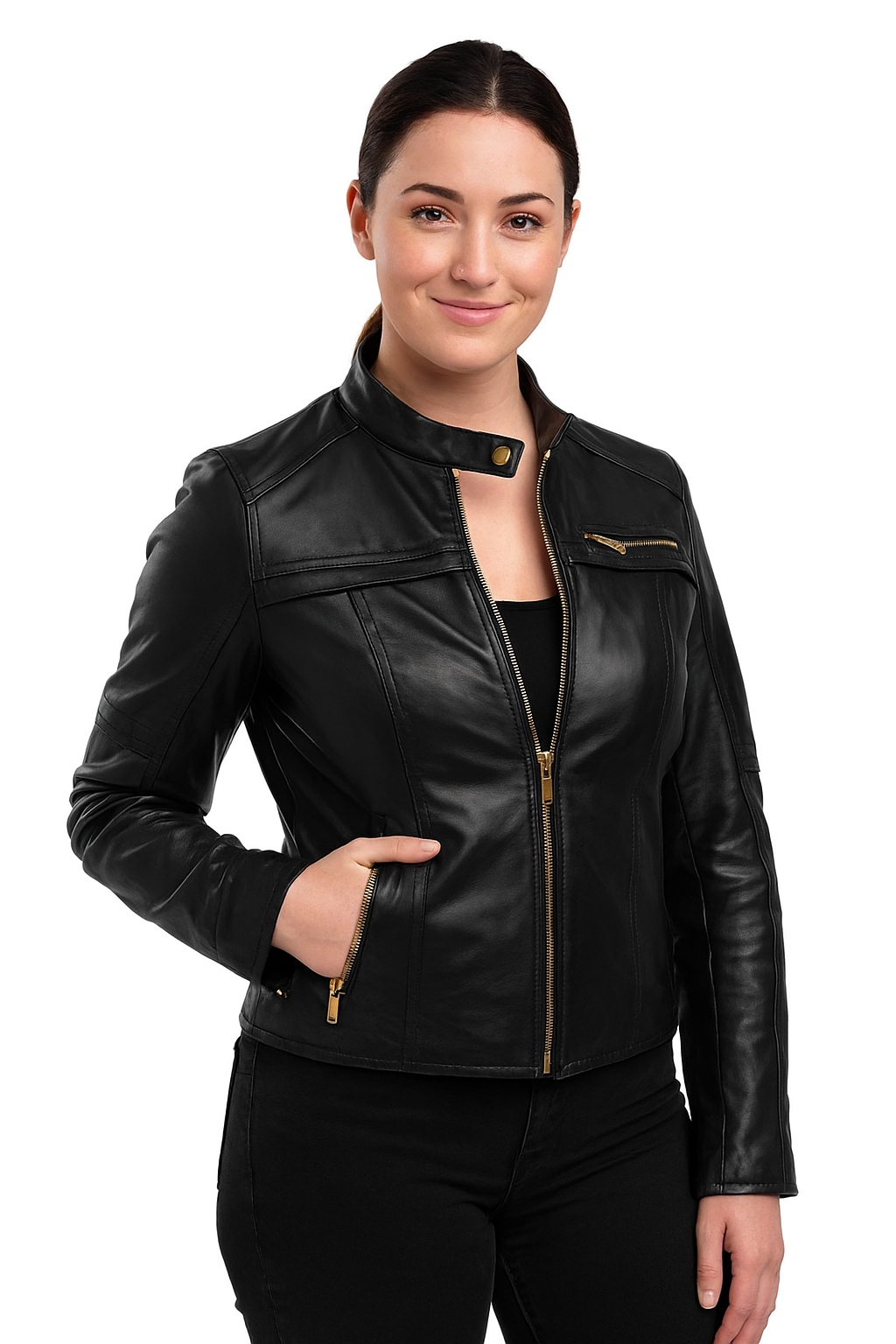 Make a bold style statement with this sleek black cropped leather jacket, tailored for a modern edge. Featuring eye-catching gold-tone zippers on the front, pockets, and cuffs, this jacket offers both functionality and a touch of glam. The structured shoulders and clean seam lines create a flattering silhouette, while the snap-tab collar adds a chic finishing touch. Perfect for pairing with jeans or skirts, it’s a wardrobe essential for any fashion-forward woman.