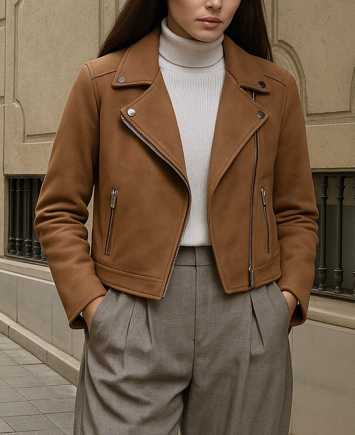 A chic take on the classic biker, crafted in a smooth suede-finish camel leather. This cropped women’s jacket features a sharp notch lapel with snap details, an asymmetrical front zipper, and sleek vertical zip pockets. Clean lines and a tailored fit make it an easy layer from weekday to weekend.
