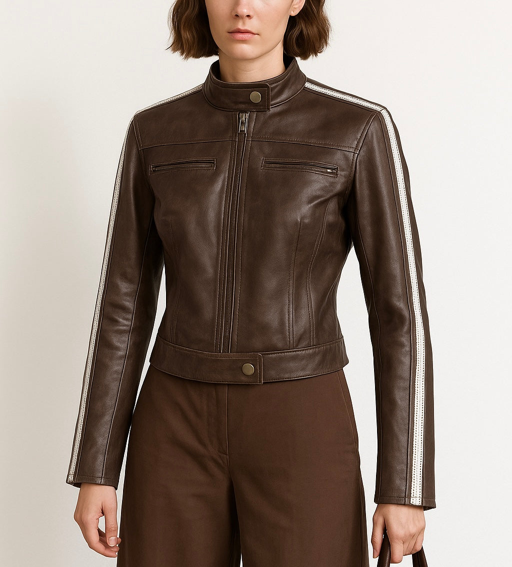 Sporty and sleek, this café racer jacket is cut in smooth chocolate-brown leather with a modern stand collar and snap tab. A clean front zipper, twin horizontal zip chest pockets, and contrast racing stripes along the sleeves give it a track-inspired edge. Tailored seams and a cropped waist create a flattering, feminine fit.