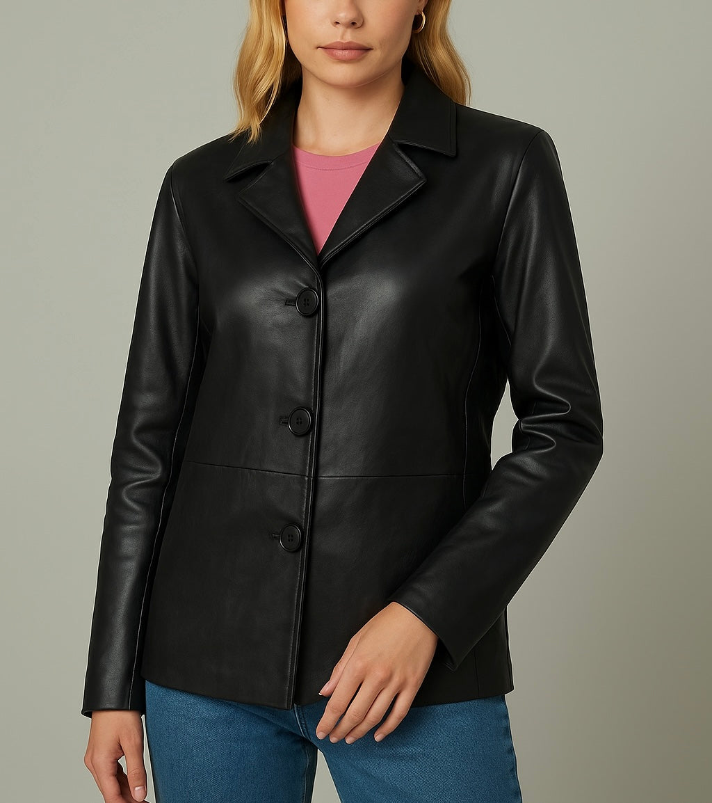 Polished and timeless, this women’s leather blazer brings a sleek, minimalist look to any outfit. Crafted in smooth black leather with a sharp notch collar and a clean three-button front, it’s tailored to a flattering, hip-length silhouette that pairs effortlessly with denim or dresses for work or weekends.