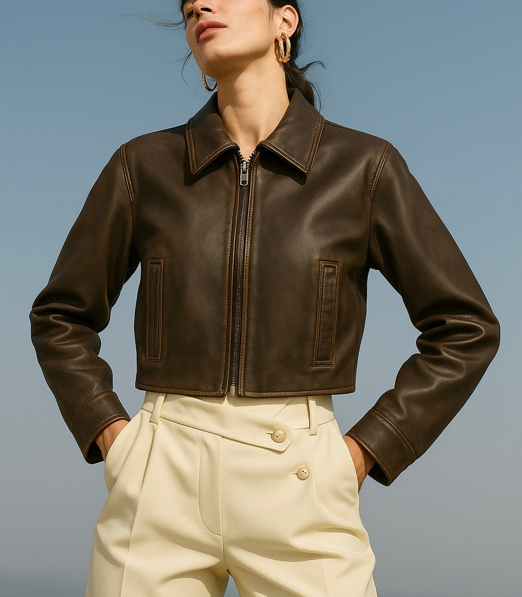 A clean, modern layer in a rich dark brown. This cropped leather jacket features a sharp shirt-style collar, smooth front zipper, and sleek vertical welt pockets. Subtle topstitching and lightly burnished edges add polish, while the boxy silhouette pairs perfectly with high-waist trousers or skirts.