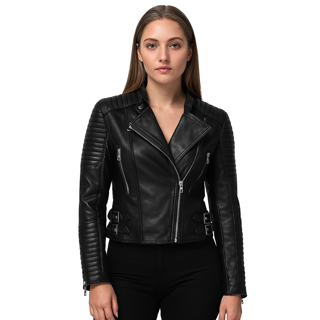 Women's Black Quilted Biker Leather Jacket with Stylish Buckle Detailing
