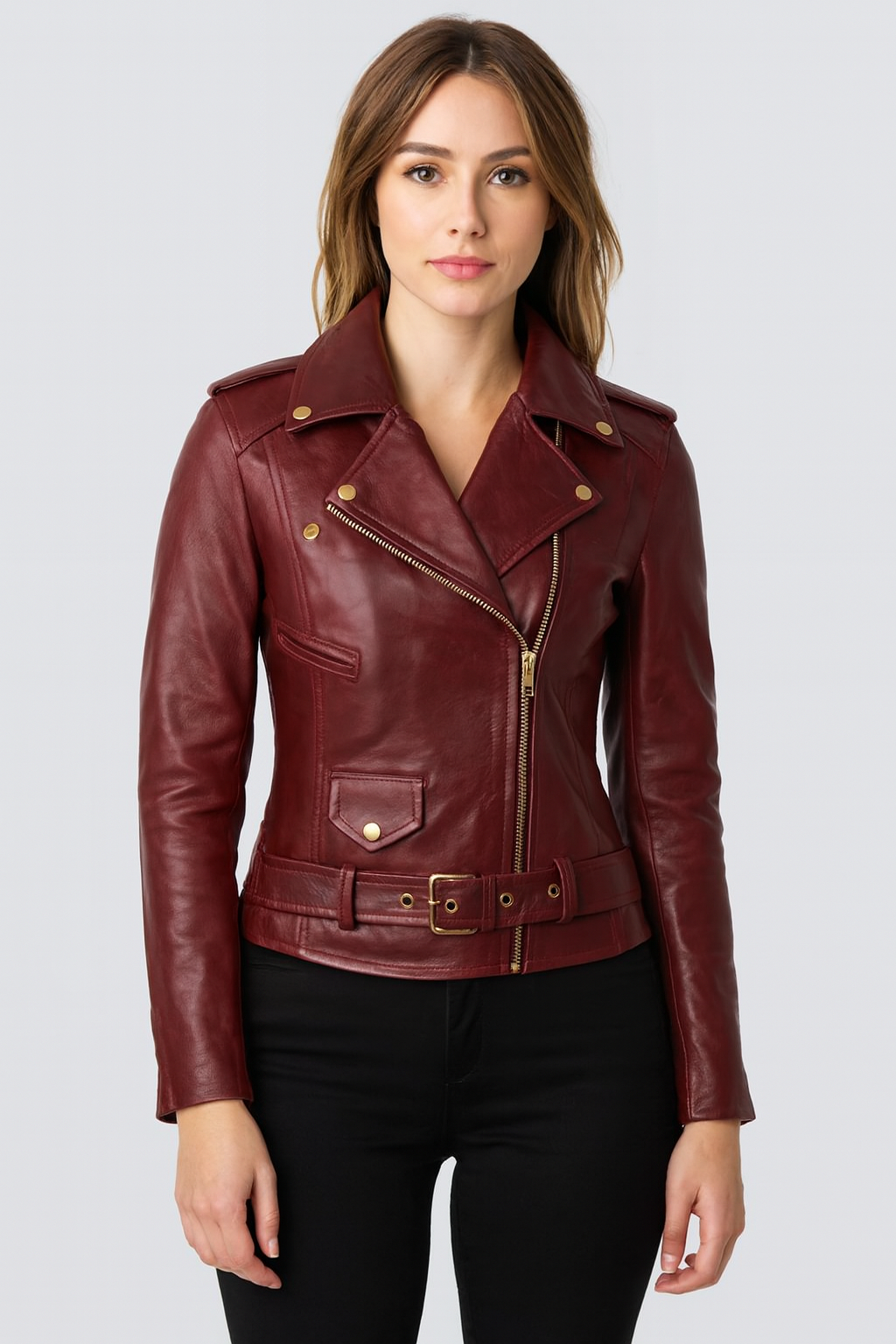 Women's Maroon Leather Biker Jacket with Asymmetrical Zipper and Waist Belt
