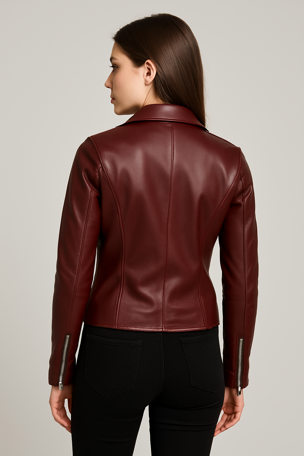 This bold maroon leather biker jacket is designed for women who love to make a statement. Crafted from high-quality leather, it features an asymmetrical front zipper, classic lapel collar with snap buttons, and a belted waist for a snug, stylish fit. Functional pockets and tailored sleeves add to its edgy, modern appeal—perfect for casual outings, rides, or elevating any street-style look.